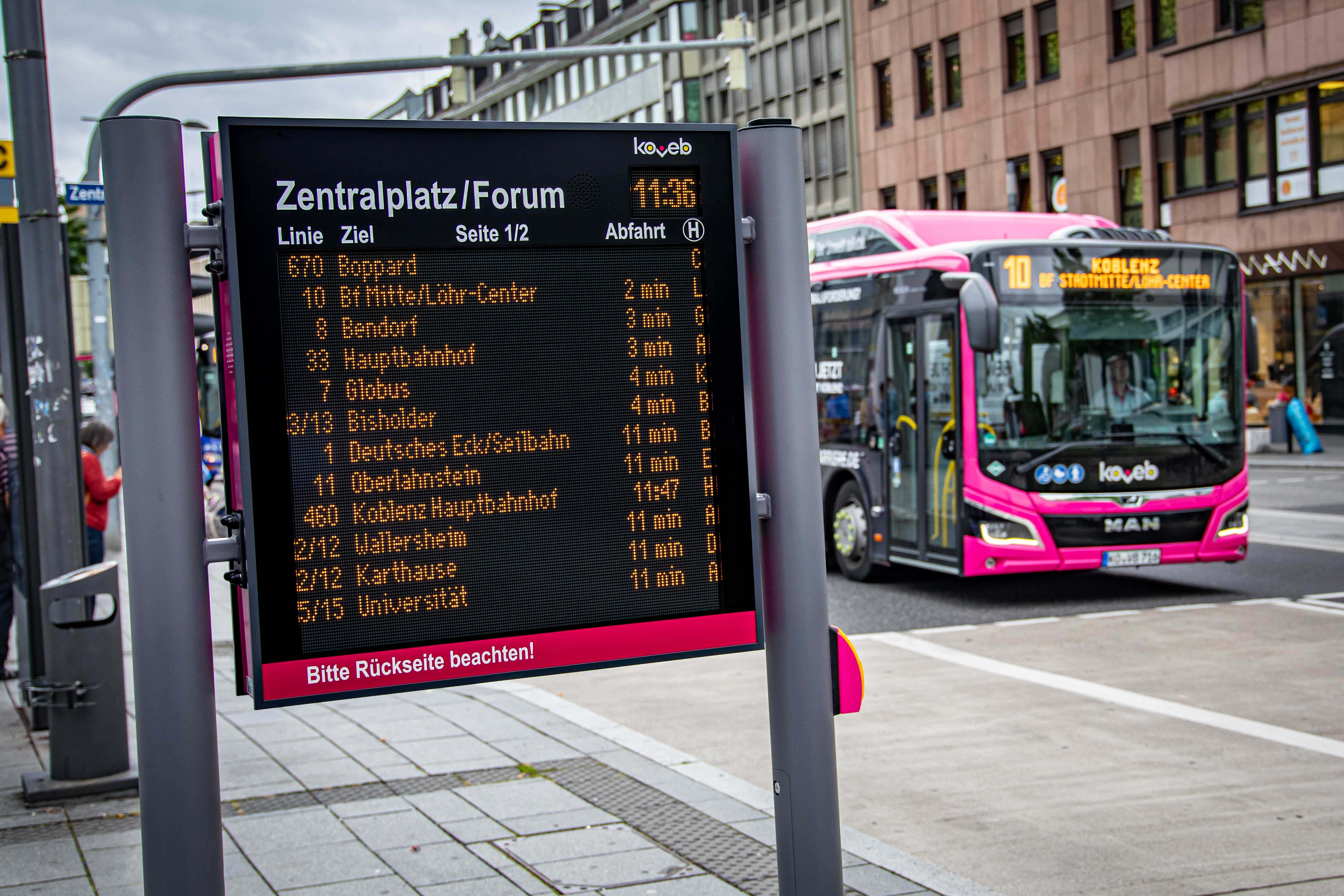 Ein großer Schritt für die Digitalisierung der Koblenzer ÖPNV-Infrastruktur: Auf dem Zentralplatz hat die koveb flächendeckend moderne DFI-Anzeiger installiert und erfolgreich in Betrieb genommen. Die digitalen Displays an den Fahrsteigen versorgen Fahrgäste mit Echtzeitdaten und aktuellen Verkehrsinformationen. Besonderheit am Standort Zentralplatz sind zusätzliche große Übersichts-Anzeiger, die Umsteigemöglichkeiten und Anschlusszeiten aller Linien zeigen. Damit wird das Busfahren künftig einfacher und übersichtlicher. Am Zentralplatz verzeichnete die koveb auf ihren eigenen Linien 2023 Einsteigerzahlen von über 1,4 Millionen Menschen im Jahr.