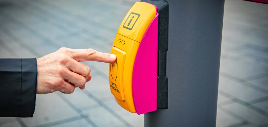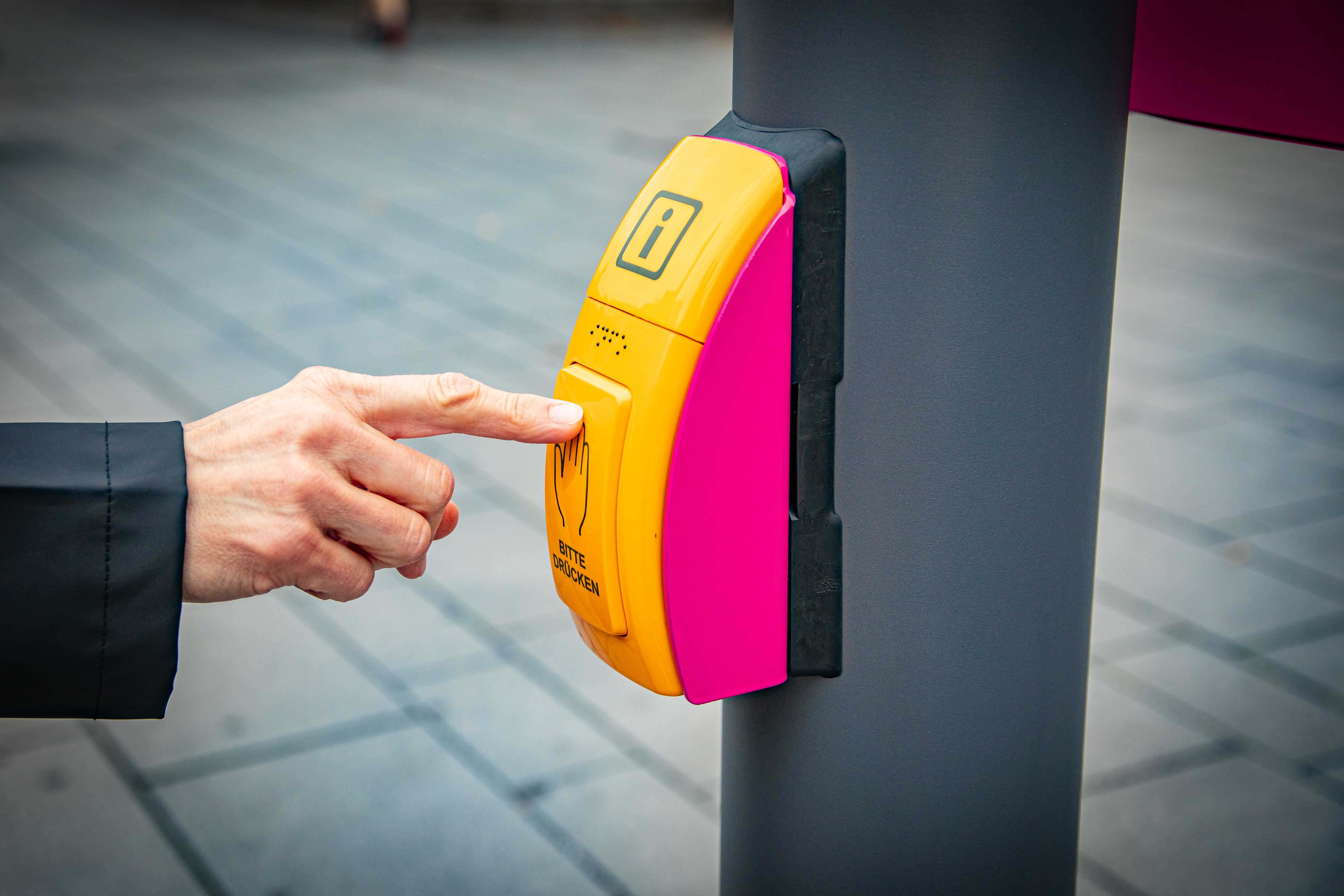 Am Mast der DFI-Anzeiger befindet sich ein sogenannter „TTS-Taster“ („Text to Speech“). Auf Knopfdruck können sich sehbeeinträchtigte Fahrgäste die im Anzeiger enthaltenen Informationen ansagen lassen – ein weiterer wichtiger Baustein im Zuge des barrierefreien Haltestellenausbaus durch die koveb, der im Stadtbild zunehmend sichtbar wird.