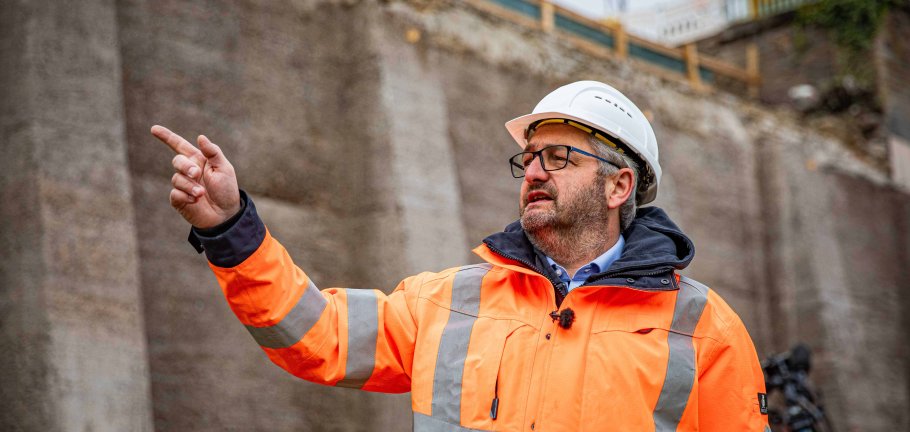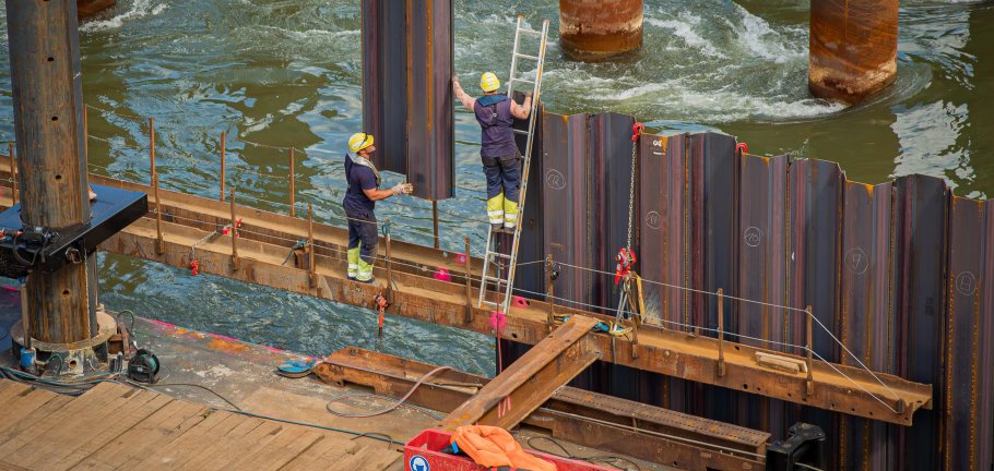 Gleichzeitig wurde auf dem ehemaligen Wasser- und Schifffahrtsamt-Gelände ein temporäres Widerlager in Seitenlage sowie eine rückverankerte Stützwand gebaut. Zudem wurde der denkmalgeschützte Rundturm zur statischen Ertüchtigung mit rund 700 Kubikmeter Beton verfüllt.