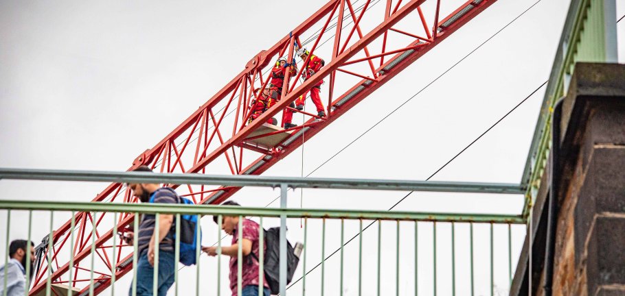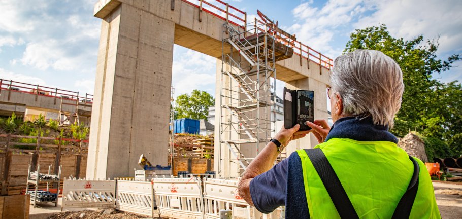 Auch in den Bereichen an Land ist im Laufe des Jahres einiges vorangekommen. Auf der Schlossseite wurden in diesem Jahr bereits vier sogenannte Pfeilerachsen/Widerlager der Vorlandbrücke in Seitenlage errichtet sowie ein Traggerüst, welches als Unterkonstruktion zur Herstellung des Überbaus dient. Damit das Baufeld in diesem Bereich sicher ist, wurden 2024 weitere Kampfmittelsondierungen vorgenommen. Hierbei wurde im August 2024 eine amerikanische Fliegerbombe gefunden. Diese konnte vor Ort erst nicht entschärft werden und musste auf die Schmidtenhöhe zur kontrollierten Sprengung abtransportiert werden. „Es ist wichtig, dass solch eine große Baustelle abschnittsweise von Kampfmittelexperten freigegeben wird. Wir dürfen nicht vergessen, dass dieser Bereich der Stadt im Zweiten Weltkrieg unter besonders starkem Beschuss stand und später beim Wiederaufbau Trümmerschutt für die Auffüllungen verwendet wurde“, erklärt Mifka die Besonderheit des Baufeldes.