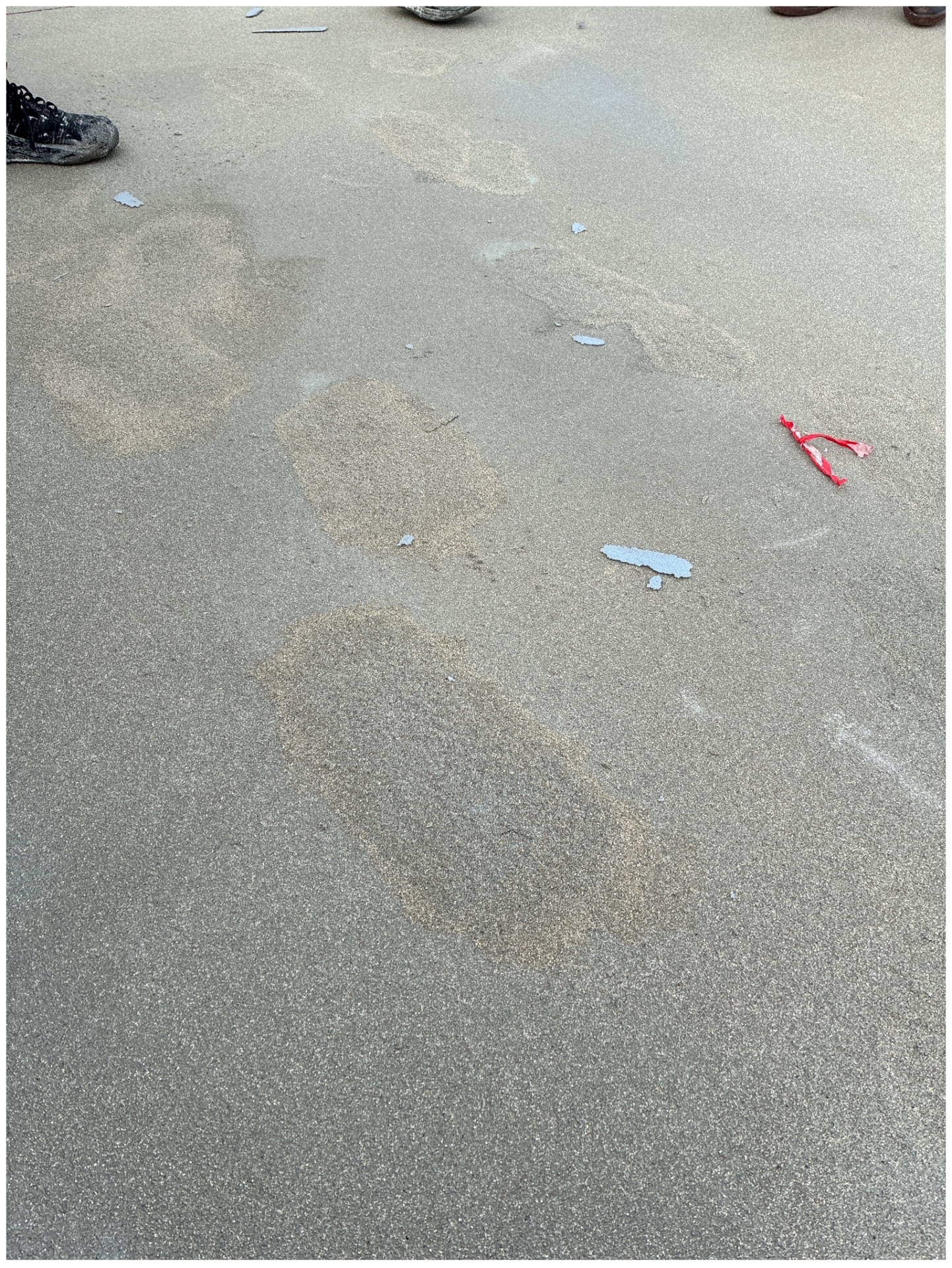 Zufußgehende sind durch den abgesperrten Bereich während der Trocknungsphase des Belages gelaufen, weshalb nun ein Schaden entstanden ist.