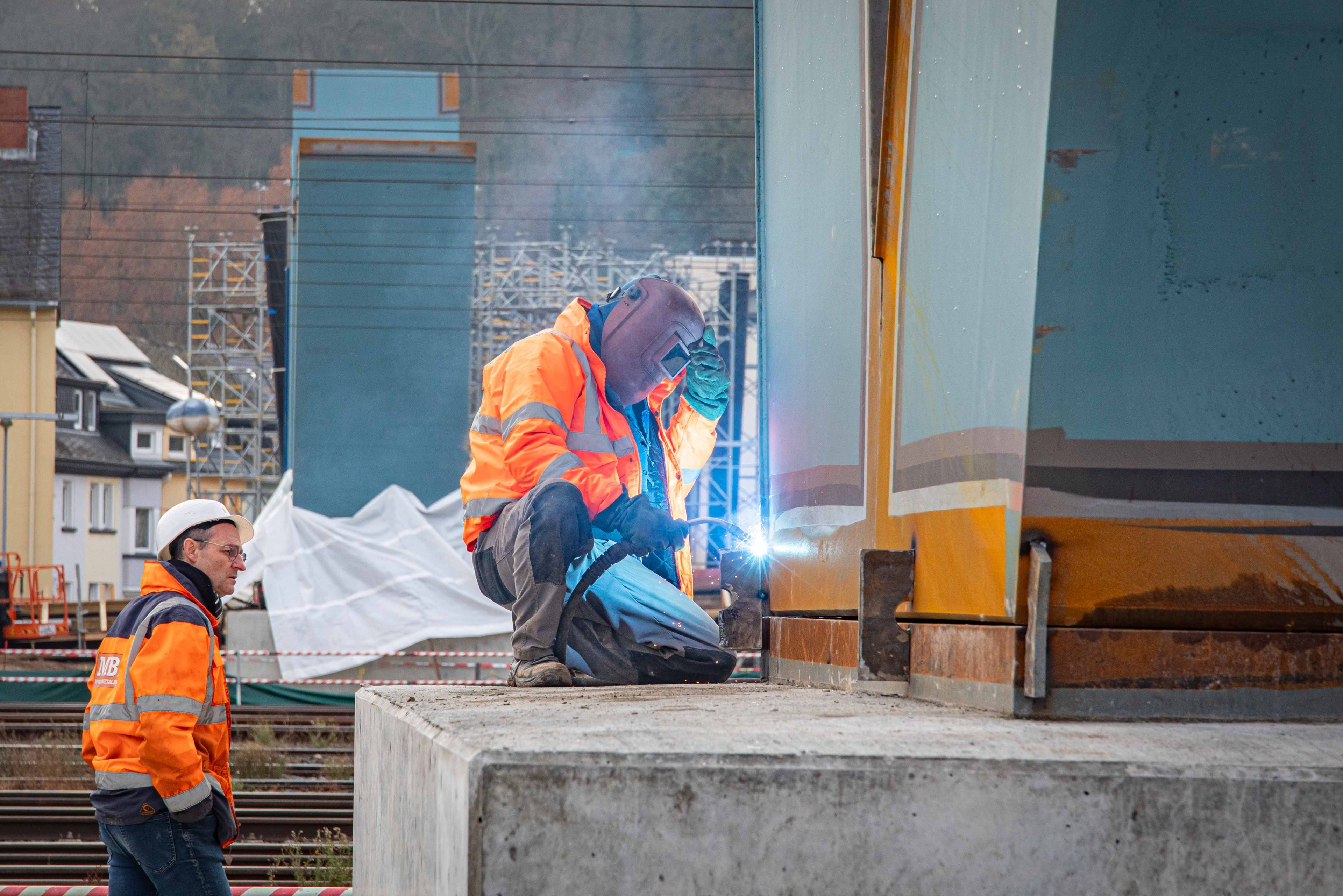 Während im Vordergrund die Schweißarbeiten am gerade eingehobenen V-Pfeiler im Rauental gerade erst beginnen, sind in der Goldgrube die Arbeiten bereits weiter fortgeschritten. Foto: Stadt Koblenz/Andreas Egenolf
