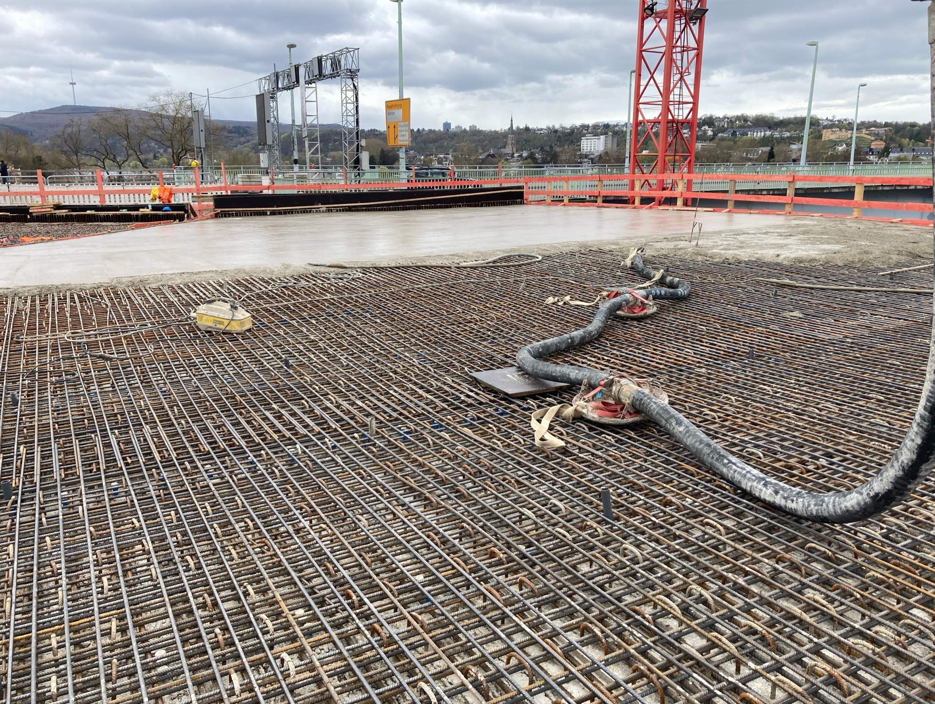 Als Vorarbeiten wurden in den vergangenen Wochen sichtbare blaue Stahlträger für die Unterkonstruktion angeliefert und eingehoben. Im Nachgang mussten noch Betonfertigteilplatten verbaut werden, diese wurden entsprechend mit Stahl bewehrt, sodass die finale Betonage zur Ausführung kam. Insgesamt wurden rund 80 m³ Beton von ca. 14 Betonmischfahrzeugen angeliefert und verbaut. Die Behelfsbrücke wird später als Auf- und Abfahrt für die neue Pfaffendorfer Brücke in Seitenlage genutzt. Rund um die Osterzeit wird der zweite und letzte Abschnitt der Behelfsbrücke mit derselben Menge an Beton betoniert werden.