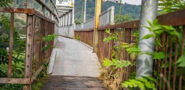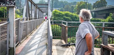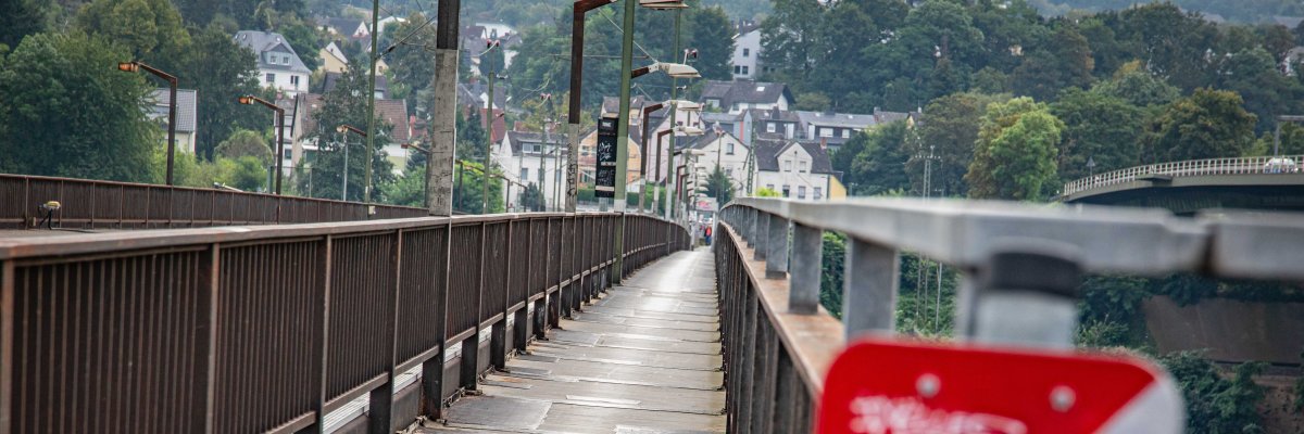 Bei Gegenverkehr fällt es Nutzerinnen und Nutzer der Brücke besonders an dieser Engstelle schwer, aneinander vorbeizukommen. Hier bedarf es ständiger Rücksichtnahme und Warten, bis entgegenkommende Fußgänger und Fußgängerinnen und Radfahrende eine Engstelle passiert haben.